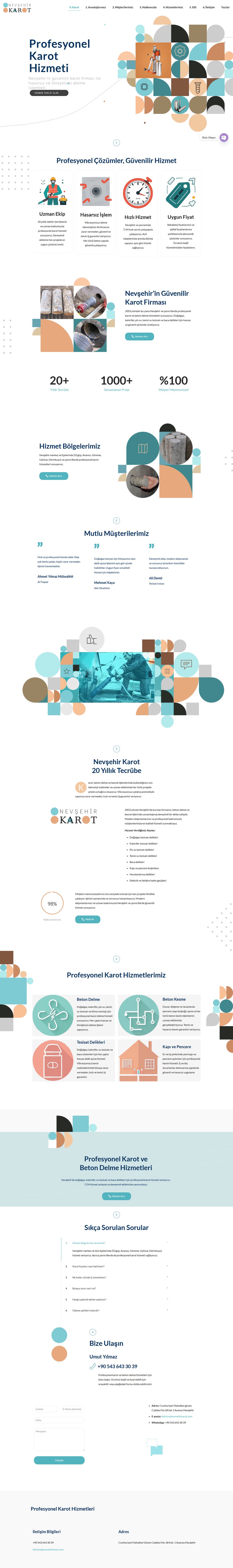 A comprehensive landing page for a professional core drilling service in Nevşehir. Built with a section-based single-page structure covering advantages, client references, services, FAQ, and contact — including reference client logos and an FAQ section.