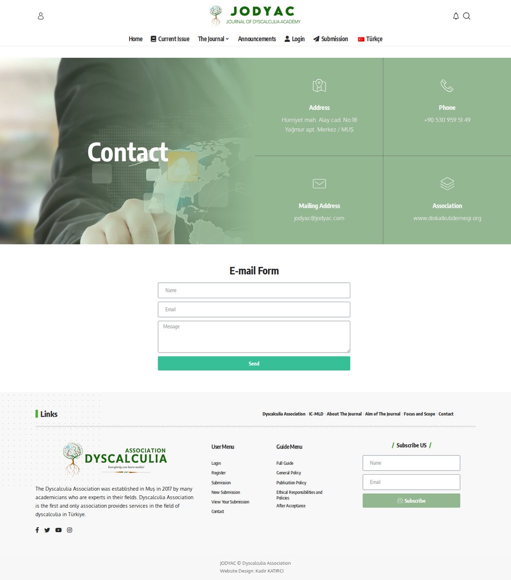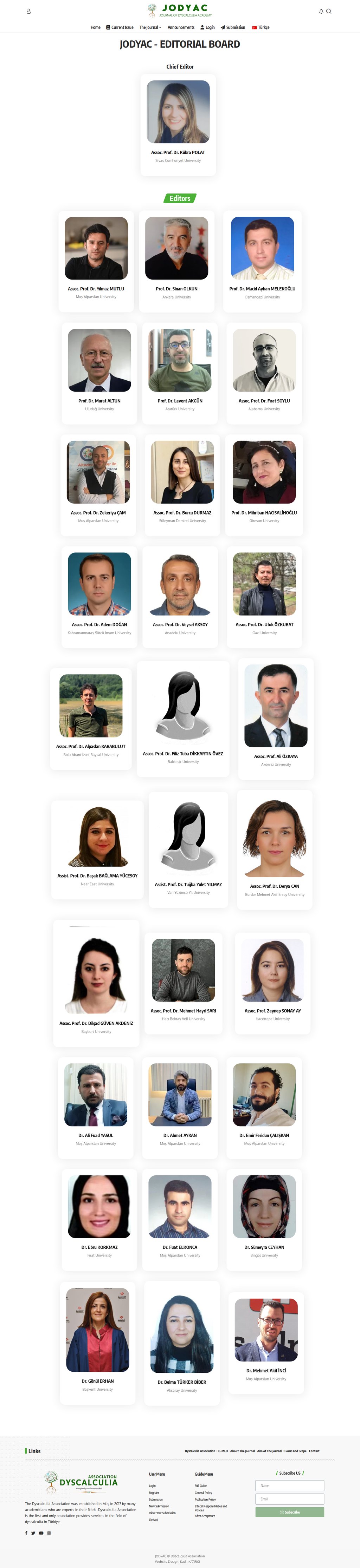 Diskalkuli alanında uluslararası akademik bir dergi platformu. Araştırmacılara yayın rehberi, editorial board bilgisi ve duyurular sunan bilimsel bir iletişim sitesi. Full Guide yazar kılavuzu, Editorial Board üye listesi ve duyurular bölümü içeriyor. Birincil dil İngilizce, Türkçe dil desteği mevcut.