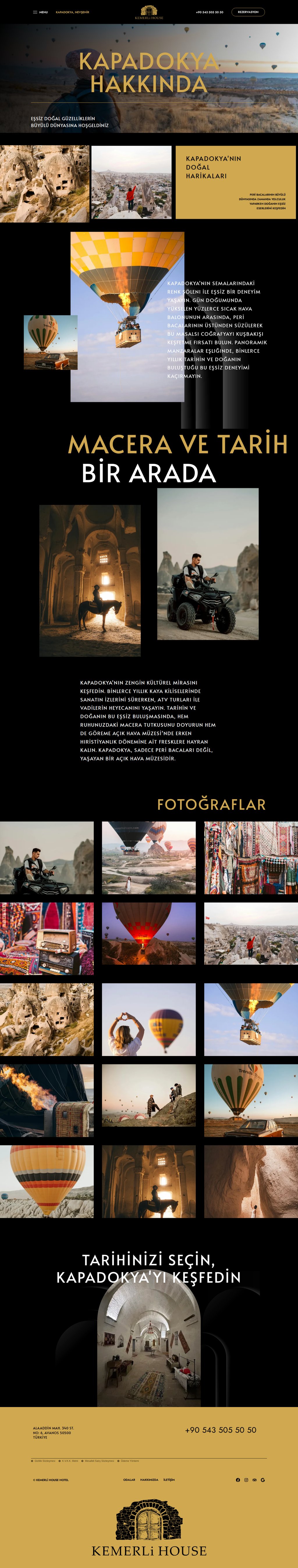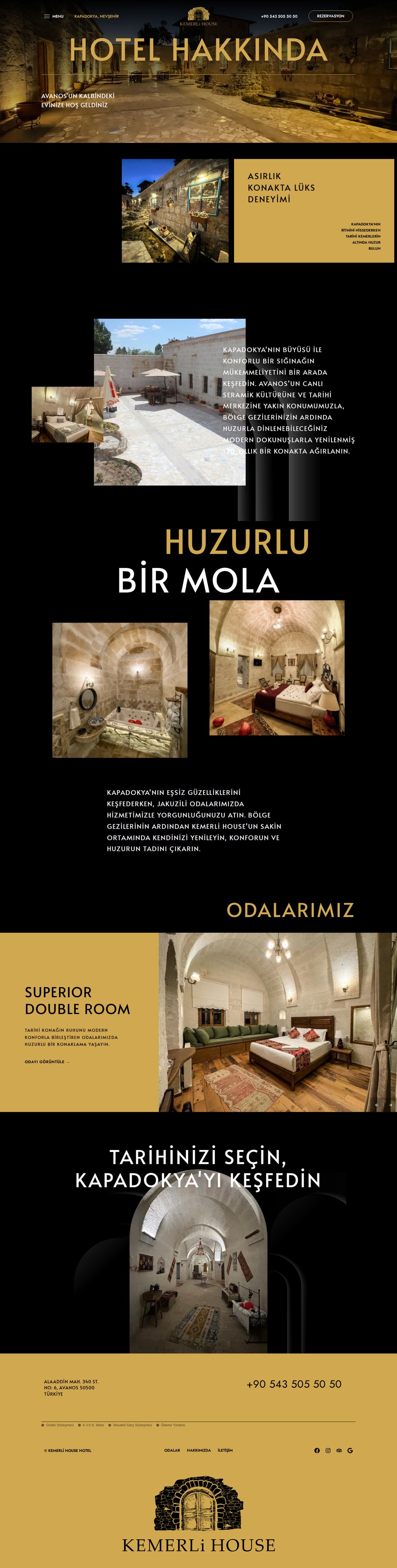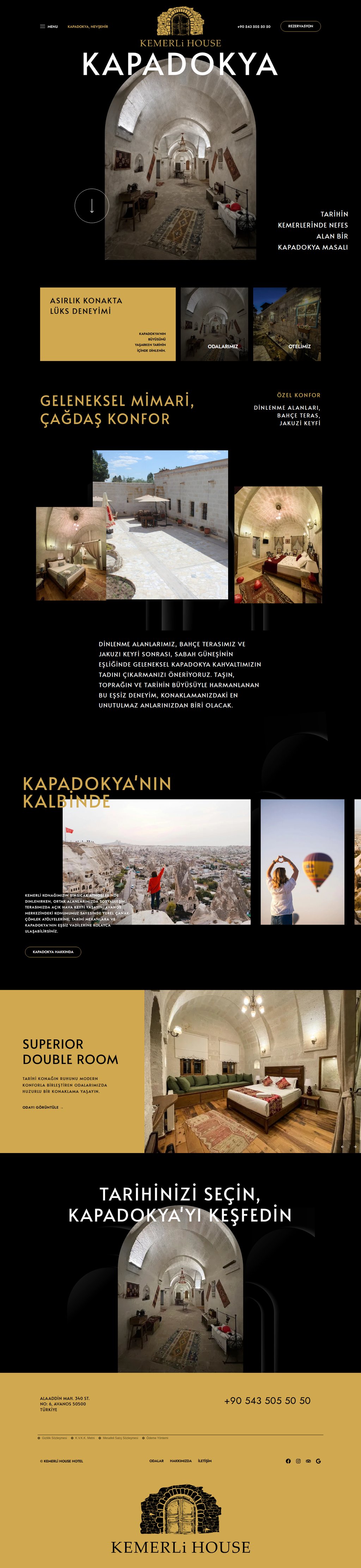 Kapadokya Avanos'ta tarihi bir konakta faaliyet gösteren butik otel. Geleneksel mimarisi ve modern konforu bir arada sunan Kemerli House Hotel, Reseliva rezervasyon sistemiyle entegre çalışıyor. Her oda için ayrı detay sayfası ve çevrimiçi rezervasyon entegrasyonu içeren iki dilli yapı.