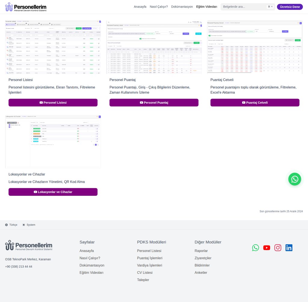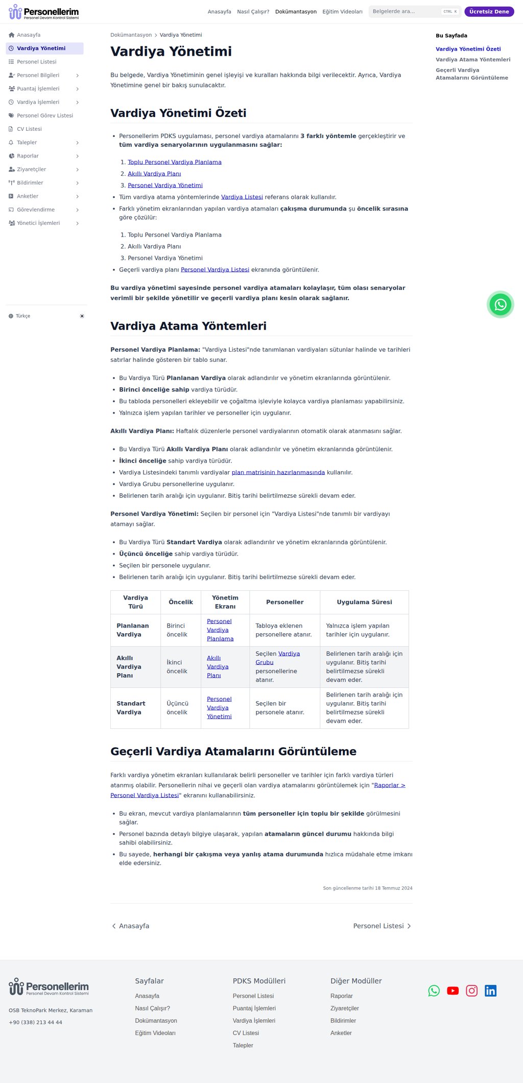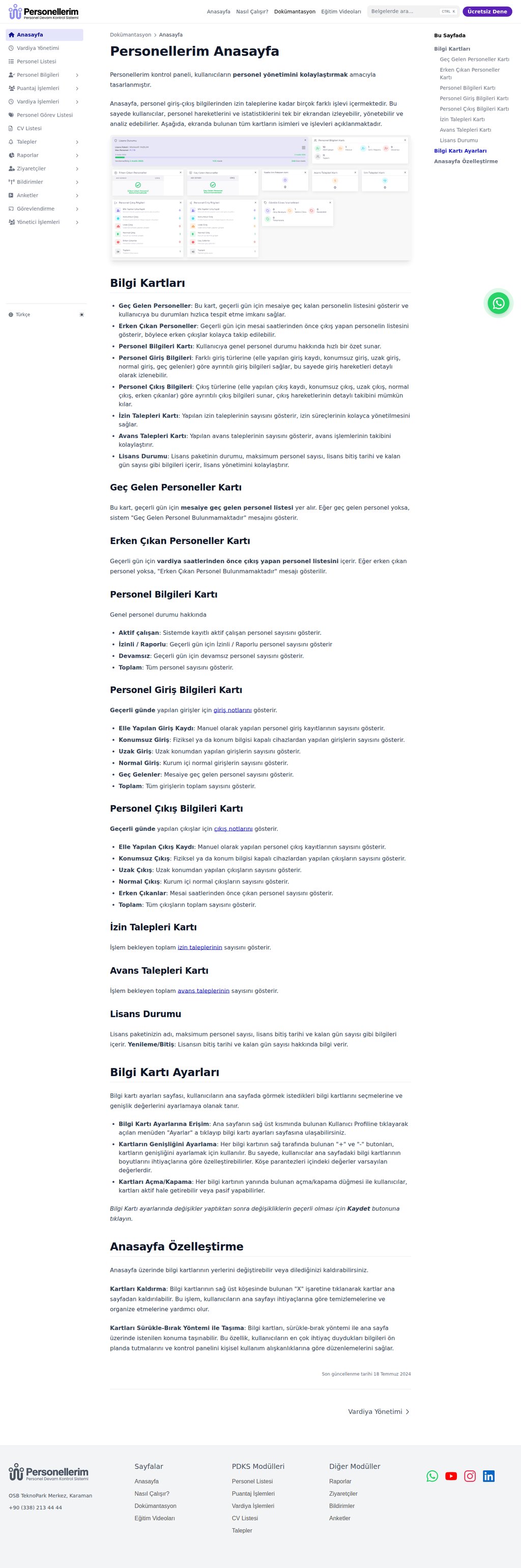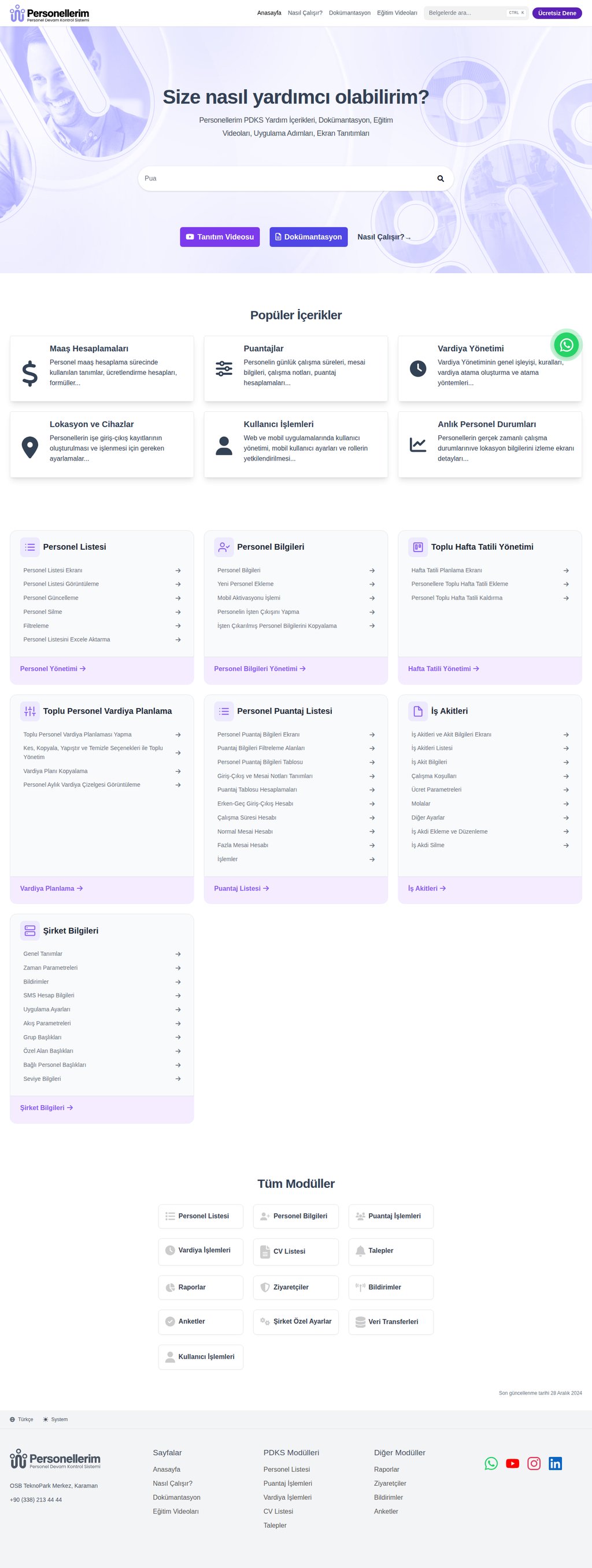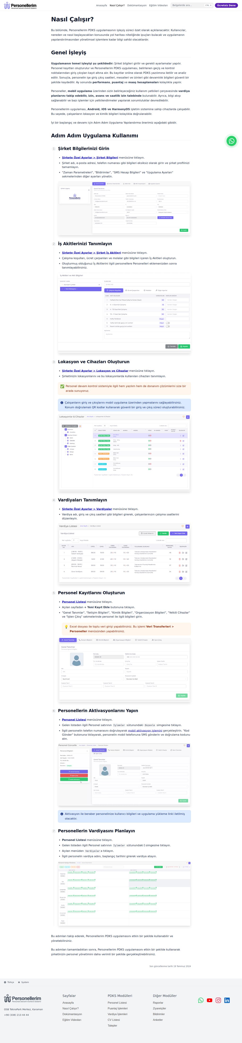 Personellerim PDKS ürününe ait kapsamlı kullanıcı dokümantasyon sitesi. Modül bazlı rehberler, nasıl çalışır anlatımları ve eğitim videoları içeriyor. Arama özellikli navigasyon yapısı ve modül bazlı içerik hiyerarşisiyle organize edilmiş.